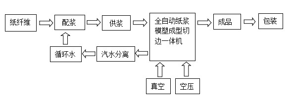 经供浆系统完成制备浆料后,浆泵将浆液通过管道输送到EAMC型一体机的吸附成型浆槽内,沉入浆液中的吸滤成型模具利用真空吸附纸浆纤维制成湿坯,湿纸模坯的含水率通常在65 %- 75%。每个纸模制品的重量可以通过调节真空吸滤时间来控制。接着,湿纸模坯被转移到热压定型模具内被干燥并固化定型,热压定型模具的温度约为180℃ - 200℃,可以采用电加热或导热油加热。被干燥并固化定型的制品被转移到切边工位将制品外边边缘修切整齐,制成符合标准尺寸的产品,再经过检验包装工序,最后成品出厂。