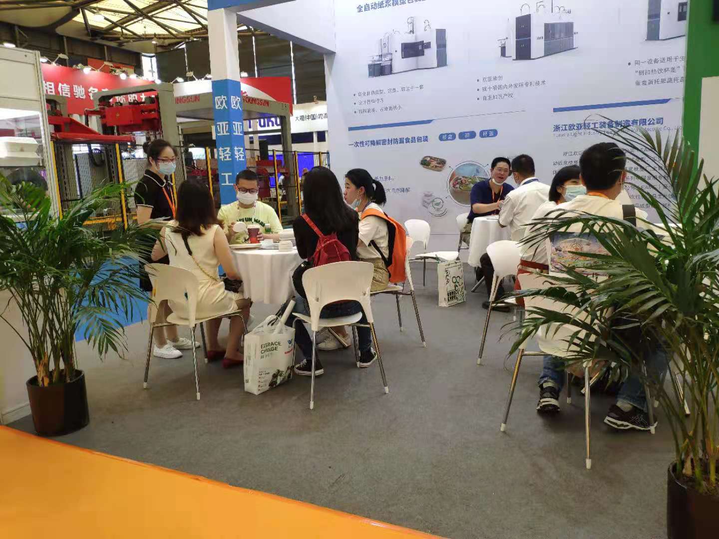2021中国包装容器展在上海新国际博览中心举行,iPackCon中国包装容器展览会是国内专业的全品种包装容器专业展示平台,集中展示纸、塑料、金属、玻璃等材质包装容器,创新包装设计,包装发展趋势以及整体包装解决方案。随着国际国内禁塑料工作的推进,可完全自然降解的植物纤维模塑制品在包装领域的地位凸显。参加本次会展的有国内植物纤维(纸浆)模塑制品制造商、设备制造商、助剂供应商。世界杯压球轻工(EAMC)参加了本次会展,展会上展出了EAMC“成型、定型、切边、打孔”一体机和EAMC纸浆模塑杯盖生产技术。
